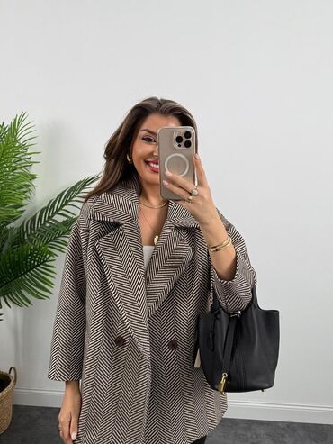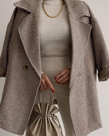 Bej rəngli qadın blazer jaket - Kəsim: Klassik, bir az oversize siluet; geniş çiyinlər, uzunluq bud hizasında - Material: Yumşaq, isti və formal görünüş verən qalın toxuma (payız-qışa uyğun) - Yak...