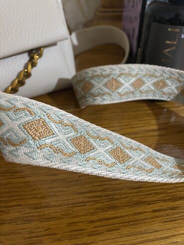 - Kəmər: enli və tam tənzimlənən, açıq mavi-bej-qızılı naxışlı toxuma; metal halqalar və tənzimləyici furnitura qızılı rəngdə