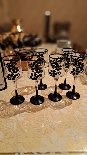 Şüşə qədəh dəsti - Sayı: 6 ədəd qədəh - Material: şüşə, mat (dumanlı) səth - Rəng: ağ-mat kasa, qara sap və ayaq - Dizayn: qara çiçək naxışı və üst kənarda qara halqa; naxışın mərkəzində kiçik bəz...