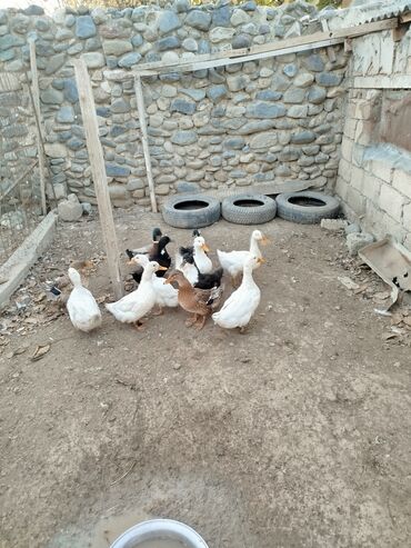 Satılır: ördək sürüsü - Növ: ağ və qara rəngli ev ördəkləri (yerli qarışıq cinslər) - Say: fotolarda çoxlu baş görülür; kiçik və orta yaşlı quşlar mövcuddur - Bəslənmə və saxlanma: açıq havada, ge...