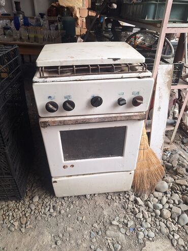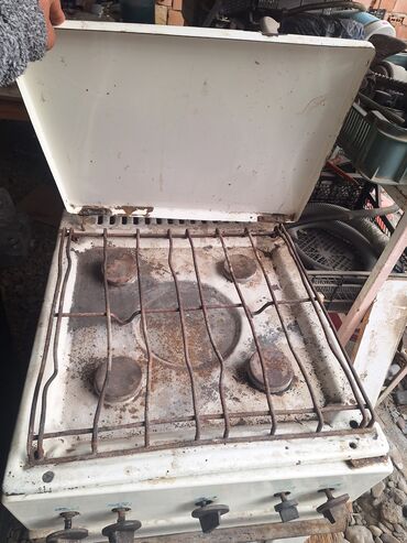 Emalatxana, bağ evi və ya köməkçi mətbəx üçün sadə qazla işləyən bişirmə həlli. Təmizlənməyə və texniki baxışa ehtiyaclı görünür; barmaqlıqlarda və səthdə pas izləri var. Soba və plitə hissələri mexaniki quruluşdadır.