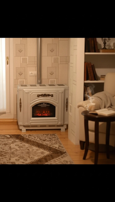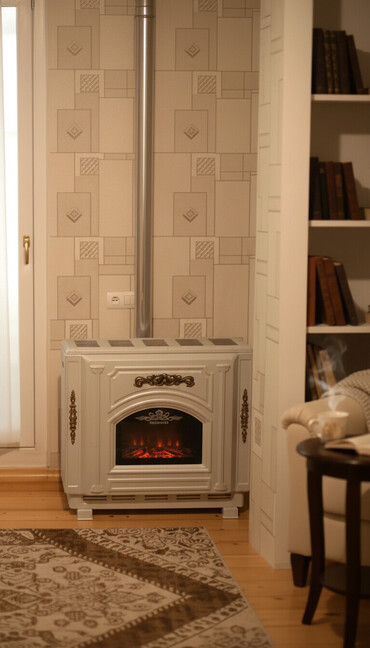 İstilik mənbəyi kimi həm funksional, həm də interyerə dekorativ toxunuş verən klassik üslublu qaz sobası.