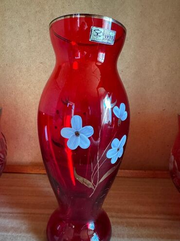 Qırmızı dekorativ vaza.Hec bir problemi yoxtu.Biri satilib,biri qalib.Qiymet 10m - Material: şüşə (rəngli, naxışlı). - Forma: yuxarıdan genişlənən silindrik forma, çoxbucaqlı altlıq. - Dizayn: şəf...