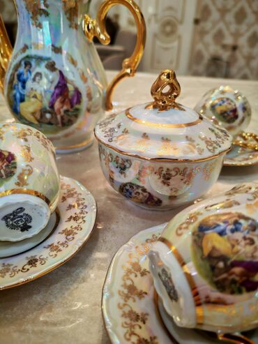 - Dekor: tam əllə işlənmiş qızılı ornamentlər, klassik romantik səhnələrdən ibarət rəngli medalyonlar