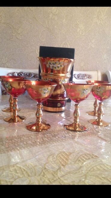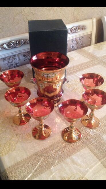 Şəkillərdə gördüyünüz dəst tam komplektdir: 6 bokal + 1 iri qab + qutu.