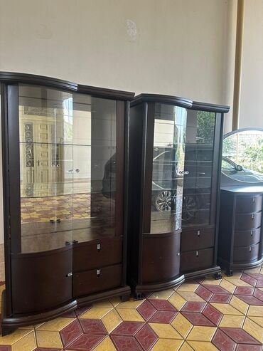 - 2 ədəd şüşə vitrin dolabı: yuxarı hissə tam şüşəli (şüşə rəflər), aşağı hissə qapalı bölmə və 2 çekmecə. Dalğalı ön dizayn, tünd qəhvəyi korpus.
