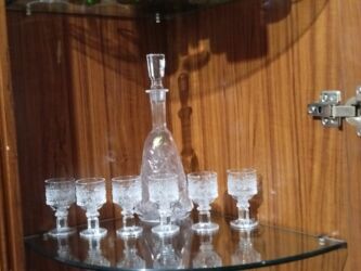 Şüşə karaf və stəkan dəsti - Tərkib: 1 ədəd şüşə karaf (qapaqlı) + 6 ədəd balaca stəkan - Material: şəffaf şüşə - Dizayn: hər bir hissədə zərif qızılı haşiyə/naxış zolaqları - Karaf: ensiz boğazlı...