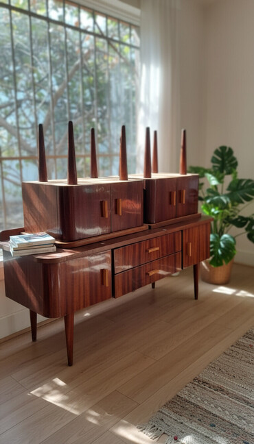 • Uzun komod/konsol – ortada 2 geniş çekmece, sağ və solda qapalı bölmələr; konusvari hündür ayaqlar