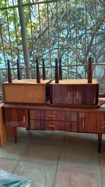 - Ölçülər (təxmini, fotoya əsasən): komod uzunluğu təxminən 1.6–1.8 m, hündür konus ayaqlar, üst modullar komod üzərində yan‑yana yerləşir