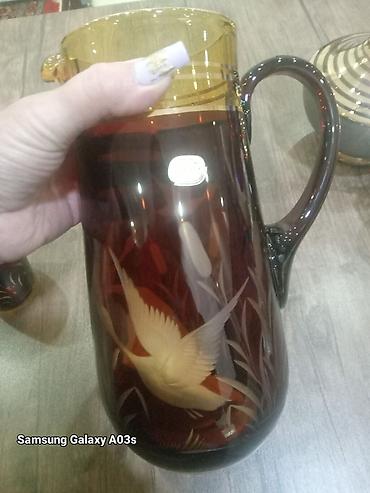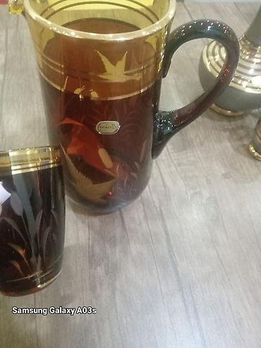 Şüşə sürahi və 6 stəkanlıq dəst - Material: qalın şüşə - Rəng və işləmə: buzlu şüşə fonu üzərində bürünc-qızılı tonlarda naxışlı kəmər; hər stəkanda və sürahidə rellefli ornament və dekorativ daş ...