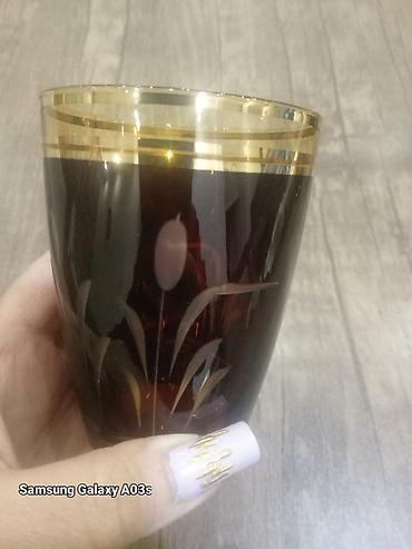 Qizil rəngli şüşə qrafin və 6 stəkanlıq dəst. - Material: qalın, şəffaf şüşə - Rəng: isti kəhrəba tonları, qızılı parlaq zolaq və üzərində güllü ornament - Komplekt: 1 qrafin (qapaqlı) + 6 ədəd ki...
