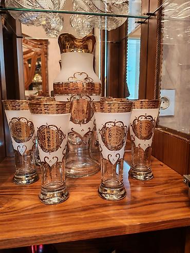 Şüşə qrafin və stəkan dəsti - Komplekt: 1 qrafin + 6 stəkan - Material: qalın şüşə - Dizayn: süd rəngli mat şüşə üzərində qızılı ornamentlər və naxışlı haşiyələr - Qrafin: tutacaqlı, geniş ağızlı,...