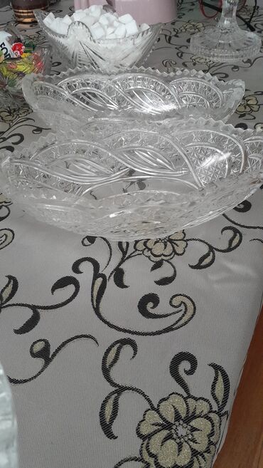 boyuk ve kicik meyve qabl - 2 ədəd ayaqlı kristal meyvə qabı: biri böyük, biri orta ölçüdə - Şəffaf, qalın kristaldan, dərin relyefli klassik naxışlar və dalğalı kənar dizayn - Sabit, kəsimli ayaq...