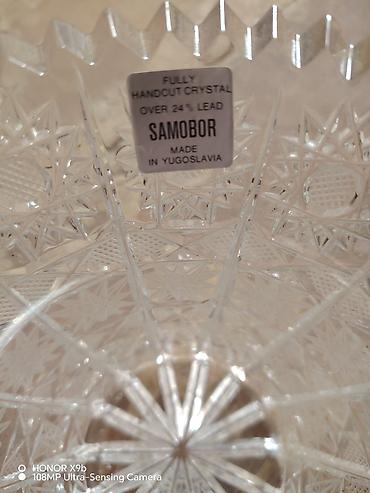 - Material: 24%+ qurğuşun tərkibli, tam əl kəsimli kristal (etiketdə göstərilib: “Fully Handcut Crystal – Over 24% Lead – Samobor – Made in Yugoslavia”)