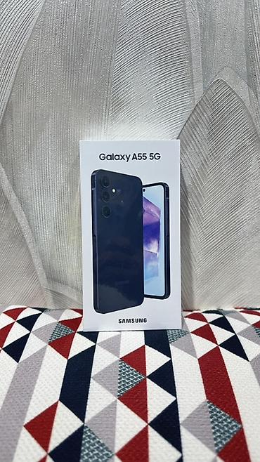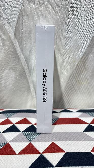 Qutulu məhsul. Qutunun üzərində rəsmi “Galaxy A55 5G” və “SAMSUNG” loqosu var.