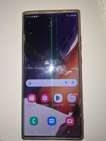 Samsung Galaxy Note20 Ultra – qara rəng Xüsusiyyətlər: - Ekran: 6.9" Dynamic AMOLED 2X, kənarlara əyimli, Always‑On Display. Ekranda şaquli yaşıl xətt görünür (şəkillərdə əks olunub). - S Pen dəst...