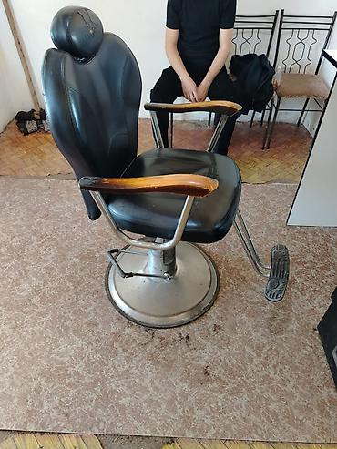 Bərbər kreslosu - Material: qara süni dəri oturacaq və arxa hissə, taxta qol dayaqları - Baş dayağı: tənzimlənən, metal möhkəmləndirmə ilə - Ayaqaltı: iri ölçülü, rezin relyefli səth, metaldan - H...