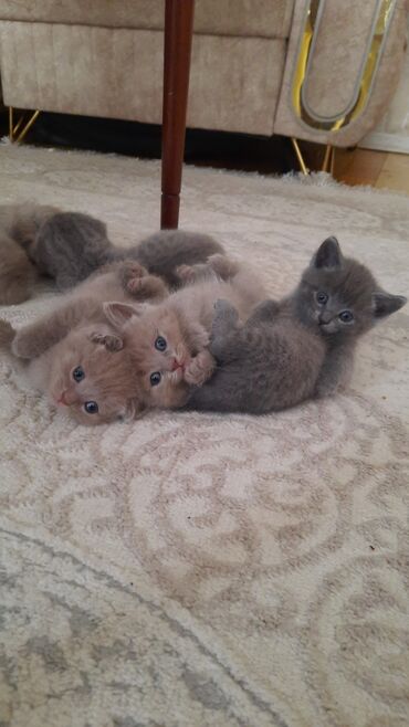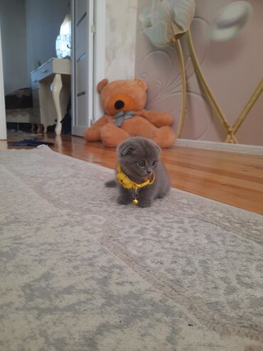 Balaca pişik balaları - Cins: Şotland qıvrımqulaq (Scottish Fold tipli görünüş – kiçik, yumulmuş qulaqlar, yumru baş və böyük gözlər) - Yaş qrupu: körpə pişiklər - Rənglər: - Tam boz (blue/boz t...