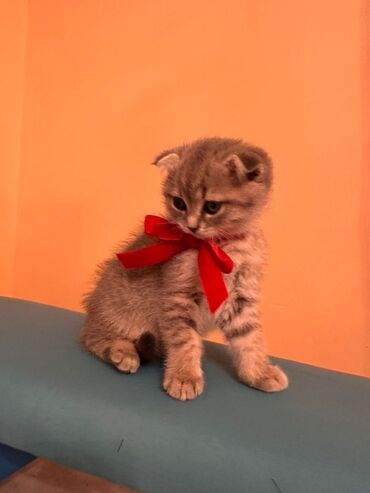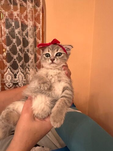 Skottiş Fold balası, cinsi erkək. Qum tərbiyələri var. 2 aylığ və çox mehribandırlar☺️ - Cins: Scottish Fold (qulaqları qatlanmış) - Rəng: gümüşü-boz tabby (zolaqlı), yumşaq və tüklü kürk - Gözlər...