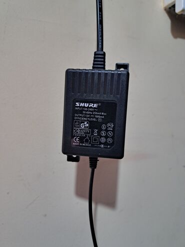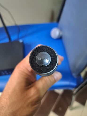 - Shure əl mikrofonu (metal tor başlıq, qara korpus, Shure loqolu kapsul; alt hissədə şarj/konnektor kontaktları)