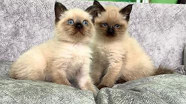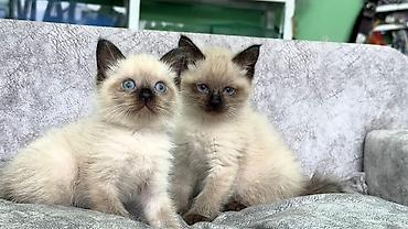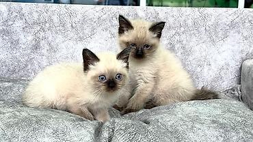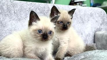 Siam tipli balaca pişiklər – mavi gözlü, açıq krem rəngli bədən və tünd “maskalı” burun-qulaq-pəncə ucları ilə.