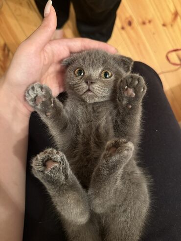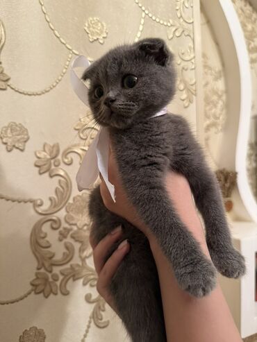 Şəkillərdə bala pişiyin müxtəlif mərhələlərdə ölçüsü və mehriban davranışı görünür: qucaqda rahat dayanır, qulaqları tipik olaraq bükülüdür, bədəni çevik və sağlam görünüşlüdür.