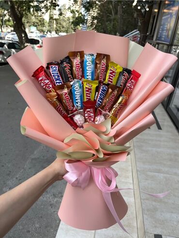 - Hər buketdə şokolad batonları balanslı şəkildə düzülür ki, forma həcimli və estetik görünsün.