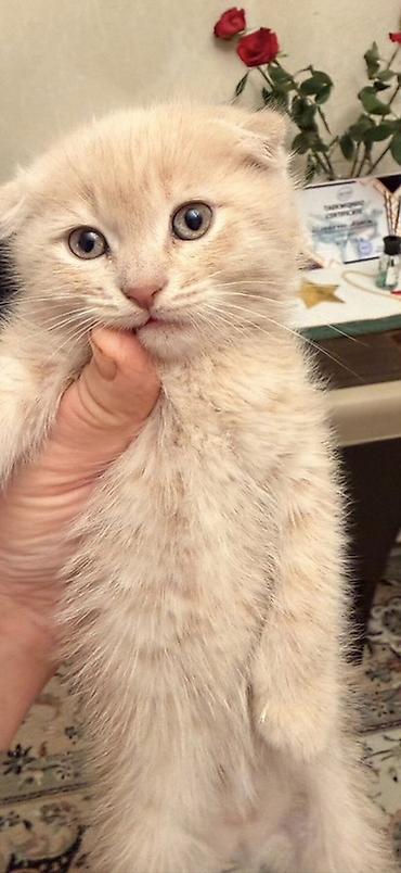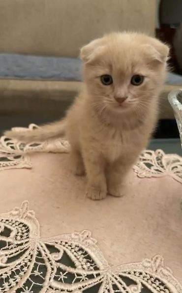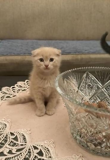 Fotolarda göstərilən balaca krem rəngli Scottish Fold ev şəraitində böyüyür, sosialdır və oyuna maraqlıdır. Yeni sahibinə sevgi dolu yoldaş olacaq.