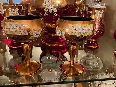 Qırmızı şüşədən hazırlanmış dekorativ qədəh dəsti - Say: 6 ədəd qədəh - Material: qalın, rəngli şüşə - Rəng və işləmə: dərin bordo ton; ağız hissəsi tam qızılı örtüklü - Bəzək: qızılı fon üzərində...