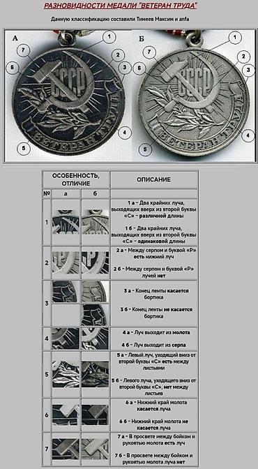 - Ön tərəf: Orta hissədə “CCCP” yazısı, çəkic-orak simvolu, günəş şüaları, aşağıda dəfnə budağı və lent üzərində “ВЕТЕРАН ТРУДА” yazısı