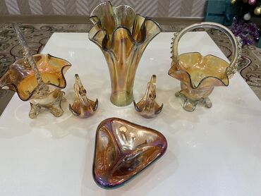 Dekorativ şüşə dəst - 5 ədəd şüşə məmulatı: 3 ədəd vaz və 2 ədəd səbət formalı şüşə qab - Rəng: qızılı-çəhrayı/kehrəba tonlarında iridessent (parıltılı) keçidli rənglənmə - Dizayn: dalğalı, büzməl...