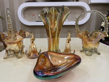 Böhm üslublu dekorativ şüşə vazalar və meyvə qabları dəsti - Material: qalın rəngli şüşə, üstü qızılı rəngli (qildən görünüşlü) dekor və əl işinə bənzər relyef çiçək naxışları - Rəng palitrası: ko...