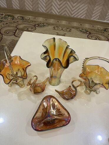 Şüşə vazalar dəsti - Dəstdə müxtəlif dizaynlarda bir neçə vaza var: qızılı-şam rəngində toxumalı (ballıca naxışlı) korpuslu vazalar, klassik hamar səthli qızılı vaza və uzunboğaz, dalğalı formalı,...