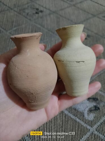 - 2 ədəd mini keramika küp (rənglər: krem və tünd torpaq tonları), əl işi teksturalı səth.