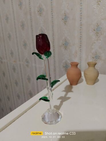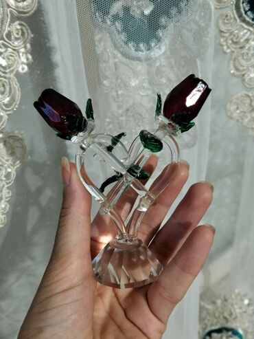 Şüşədən hazırlanmış dekorativ fiqur – iki qızılgül kompozisiyası - Material: şəffaf büllur/şüşə gövdə, tünd qırmızı qızılgül qönçələri, yaşıl yarpaq detallar - Dizayn: iki incə şüşə sapla bağlanan...
