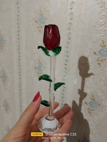 - 1 ədəd tək güllü fiqur: şəffaf şüşə gövdə, yaşıl yarpaqlar, qırmızı-bordo qönçə; çoxüzlü prizmatik dayaq.
