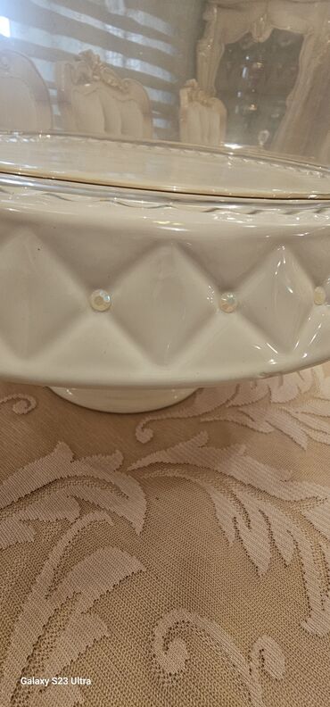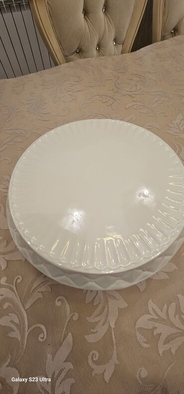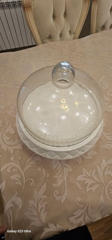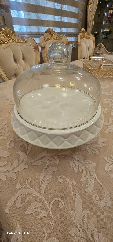 Gencede,Şüşə qapaqlı tort/biskvit qabı,kenar gasli dekorlu,gapagi suseden 100 man alinib,diametri 28 sm