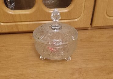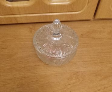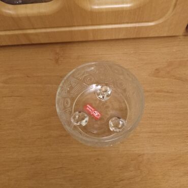 Diametri- 22. Şüşə Meyvə/Giləmeyvə Qabı - Material: şəffaf şüşə - Forma: dairəvi, alçaq dərinlikli - Dizayn: kənarları dalğalı, iç səthdə damla formalı naxışlar; mərkəzdə dekorativ relyef (quş mot...