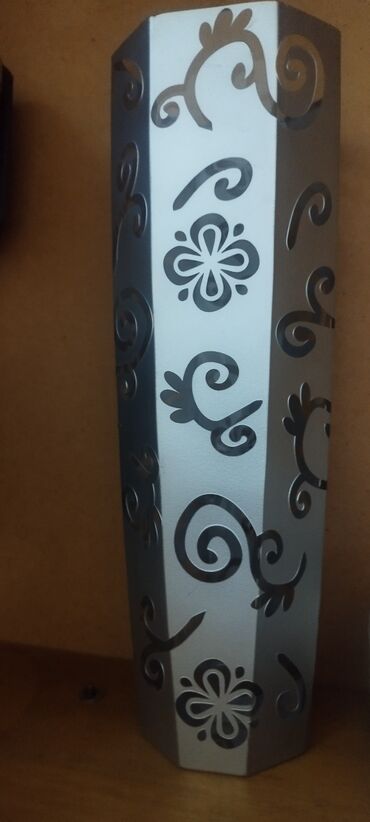 - Dekorativ metal abajur/işıq örtüyü: çoxbucaqlı forma, gümüş rəng, perforasiya olunmuş naxışlı dizayn (şəkilli kəsiklər işıqda ornament effekti yaradır).