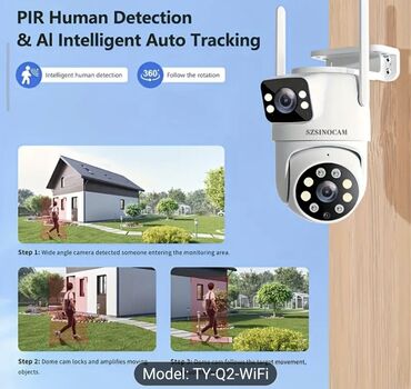 - PIR insan aşkarlanması və AI ağıllı auto-tracking: giriş sahəsinə daxil olan şəxsləri aşkar edir, hədəfi böyüdüb izləyir, 360° fırlanma ilə hərəkəti təqib edir.