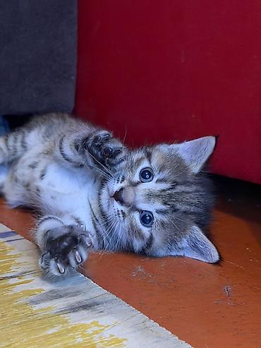 - Görünüş: Boz-qara zolaqlı (tabby) naxış, böyük mavi-göy gözlər, yumşaq tüklü balaca pəncələr. Üzdə zərif ağ ləkələr, qarında ağ bölgə.