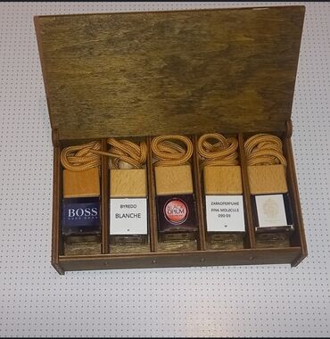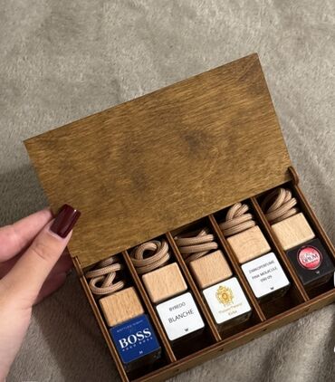 Taxta qutuda 5 ədəd asmalı avtomobil ətiri seti.