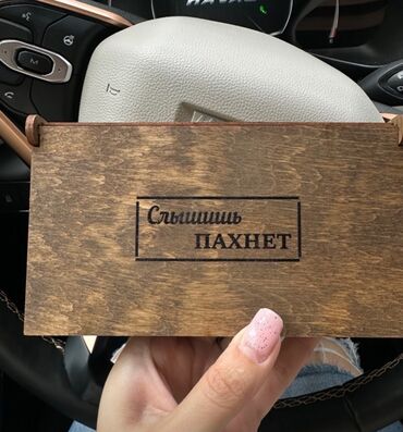 - Bərk, materialında ağacdan hazırlanmış bölməli saxlama qutusu; üst qapaqda “Слышишь ПАХНЕТ” yazısı