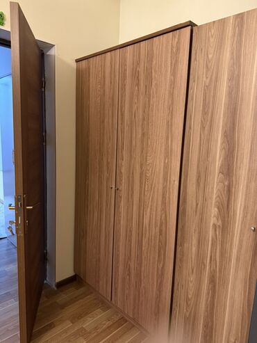 - Geniş qapılı paltar şkafı: təbii ağac naxışlı laminat səth, hündür ölçü, çox bölməli daxili quruluş, asılqan və rəflər üçün rahat saxlanma. Qapılar tutacaqlıdır.