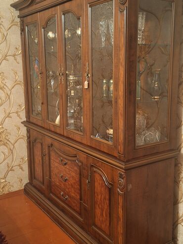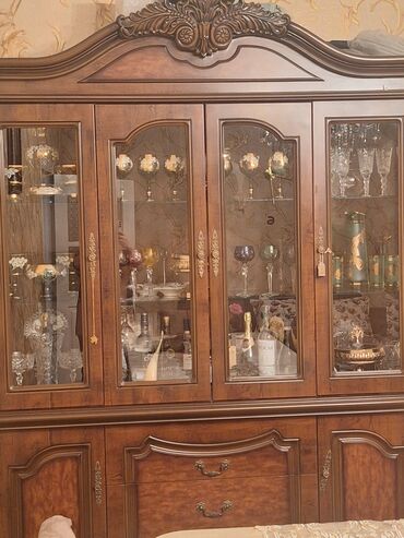 Oyma detalları və şüşə qapıları olan tünd qəhvəyi rəngli taxta vitrin şkafı. Şkafın yuxarı hissəsində dörd şüşə qapı, aşağı hissəsində isə iki şüşəsiz qapı və bir siyirmə mövcuddur. Hər qapı və siyirmənin üzərində qızılı rəngli tutacaqlar var. Bu şkaf həm əşyaları sərgiləmək, həm də saxlamaq üçün uyğundur.