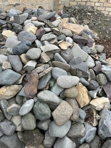 - Fraksiya və ölçülər: müxtəlif ölçülü təbii ç river/çay daşları, qaya parçaları və yonulmuş dekorativ daş elementləri (sütun-balıstrada detallarının qalıqları, kənar və plitə fraqmentləri). Kiçik çınqıldan iri qaya və bloklara qədər qarışıq fraksiyalar.