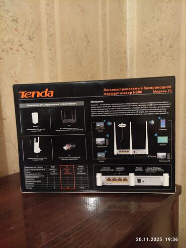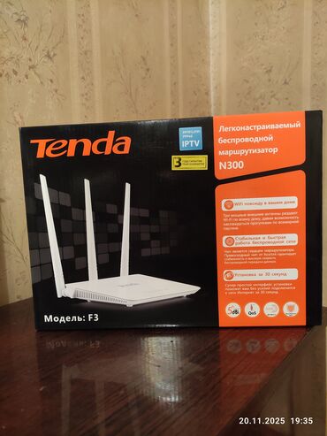 Tenda F3 N300 Wi‑Fi marşrutlayıcı - Model: Tenda F3 (N300) - Simsiz sürət: 300 Mbps (2.4 GHz) - 3 ədəd xarici antena – daha sabit siqnal və geniş əhatə - IPTV dəstəyi - Qutu üzərində: sürətli qura...