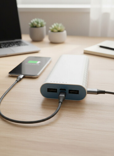 - 1x USB-C (IN) – enerji bankının doldurulması üçün - 1x micro‑USB (IN) – alternativ doldurma girişi - 2x USB-A çıxışı (OUT1, OUT2) – eyni vaxtda iki cihazı şarj edə bilir