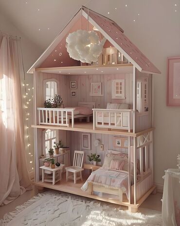 Böyük ölçülü taxta kukla evi - 3 mərtəbə, çoxsaylı otaqlar: salon, mətbəx, yemək otağı, vanna otağı, yataq/istirahət zonası, paltar otağı/beauty küncü - Balkon və açıq terras hissələri - Daxili de...