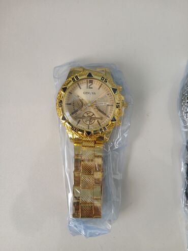 Qızılı rəngdə klassik qol saatı - Brend/işləmə: GENEVE yazılı qızılı siferblat - Korpus: qızılı tonlu dairəvi metal, yanlarda tac və iki düymə - Funksiyalar: xronoqraf alt-siferblatları, tachymete...